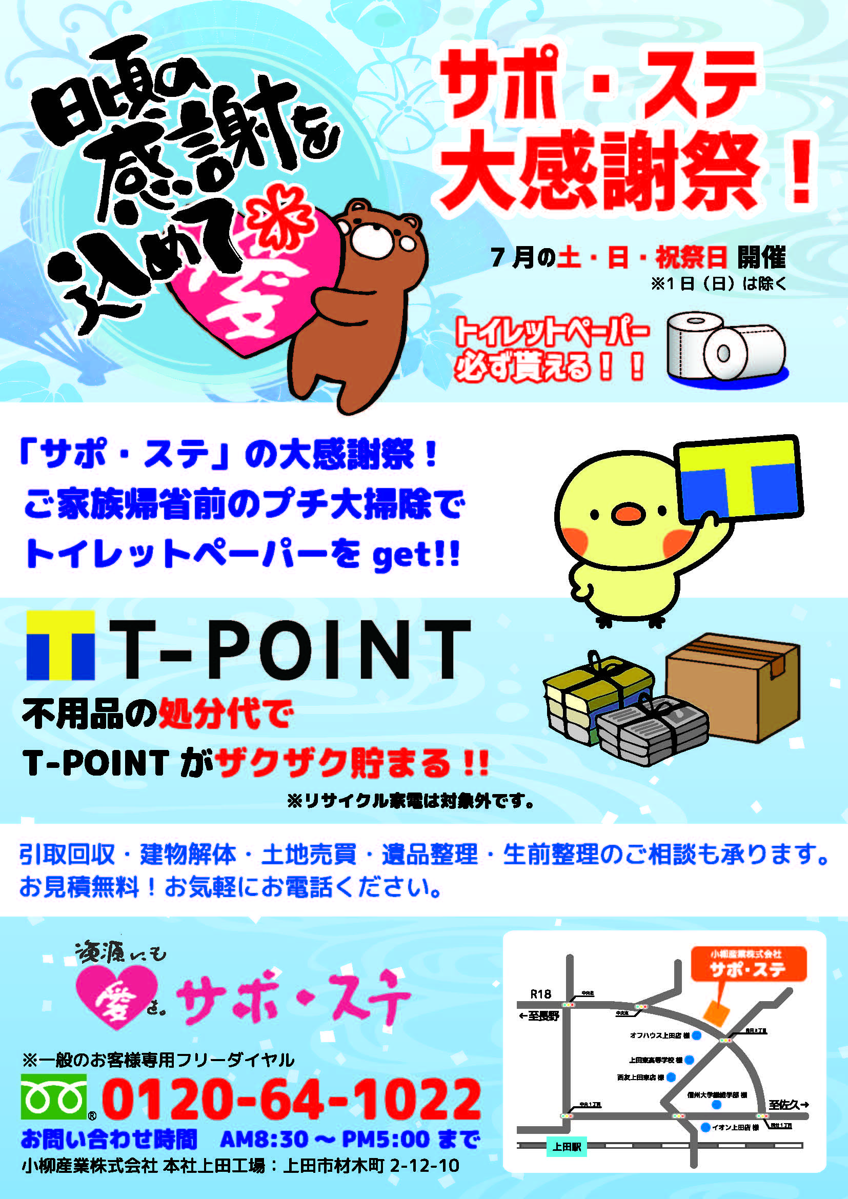 7月 「サポ・ステ」大感謝祭! 2018年6月26日 サポ・ステ by wpmaster. 日頃の感謝を込めて 「サポ・ステ」大感謝祭!を実施します。 ご家族帰省前のプチ大掃除で、トイレットペーパーをゲットしてください。 7月の下記の日に不用品をお持ちいただくと、トイレットペーパーが必ず貰えます。 7日(土)、8日(日) 14日(土)、15日(日)、16日(海の日) 21日(土)、22日(日) 28日(土)、29日(日) 以上の9日間です。 たくさんの方のお持込みをお待ちしております。 前の記事 次の記事